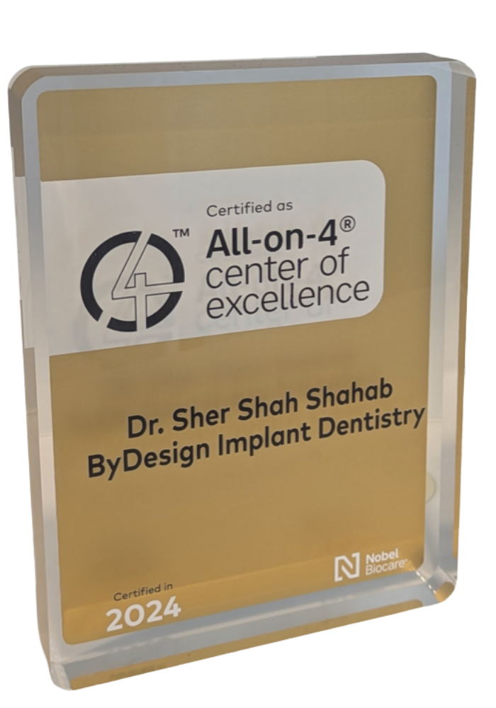 Dr. Sher Shahab and ByDesign Implant Dentistry are recognized as an All-on-4® Center of Excellence, reflecting advanced training, experience, and adherence to established treatment protocols using the All-on-4® concept.